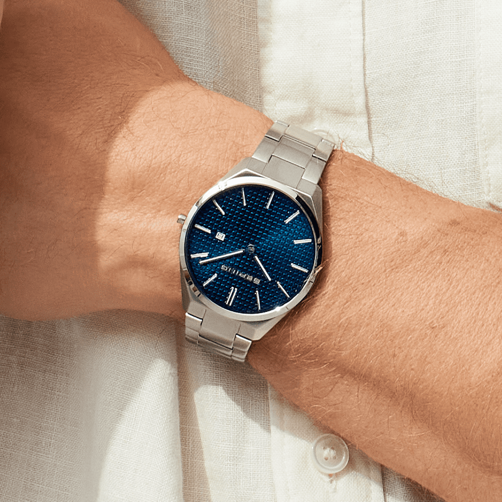 Scandinavian minimalism meets technical precision in this BERING Ultra Slim timepiece. The embossed deep blue dial showcases geometric texturing that adds visual depth while maintaining understated elegance. At just 6 mm thick, the brushed and polished stainless steel case delivers a refined, sculptural profile without excess. Silver-tone hands and markers ensure legible timekeeping, complemented by a functional date window at 3 o'clock. The solid stainless steel bracelet with folding clasp provides secure, comfortable all-day wear. Sapphire crystal protects against scratches, while the quartz movement guarantees reliable accuracy. With a 40 mm case diameter and 3 ATM water resistance, this watch balances form and function—a statement piece for those who value restraint and precision.