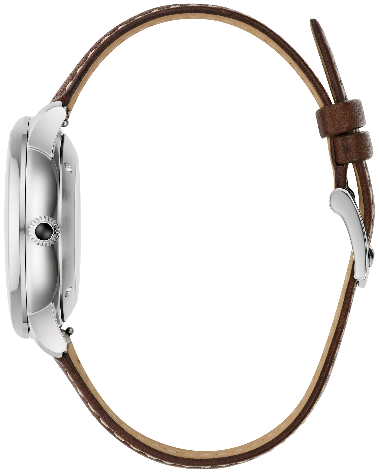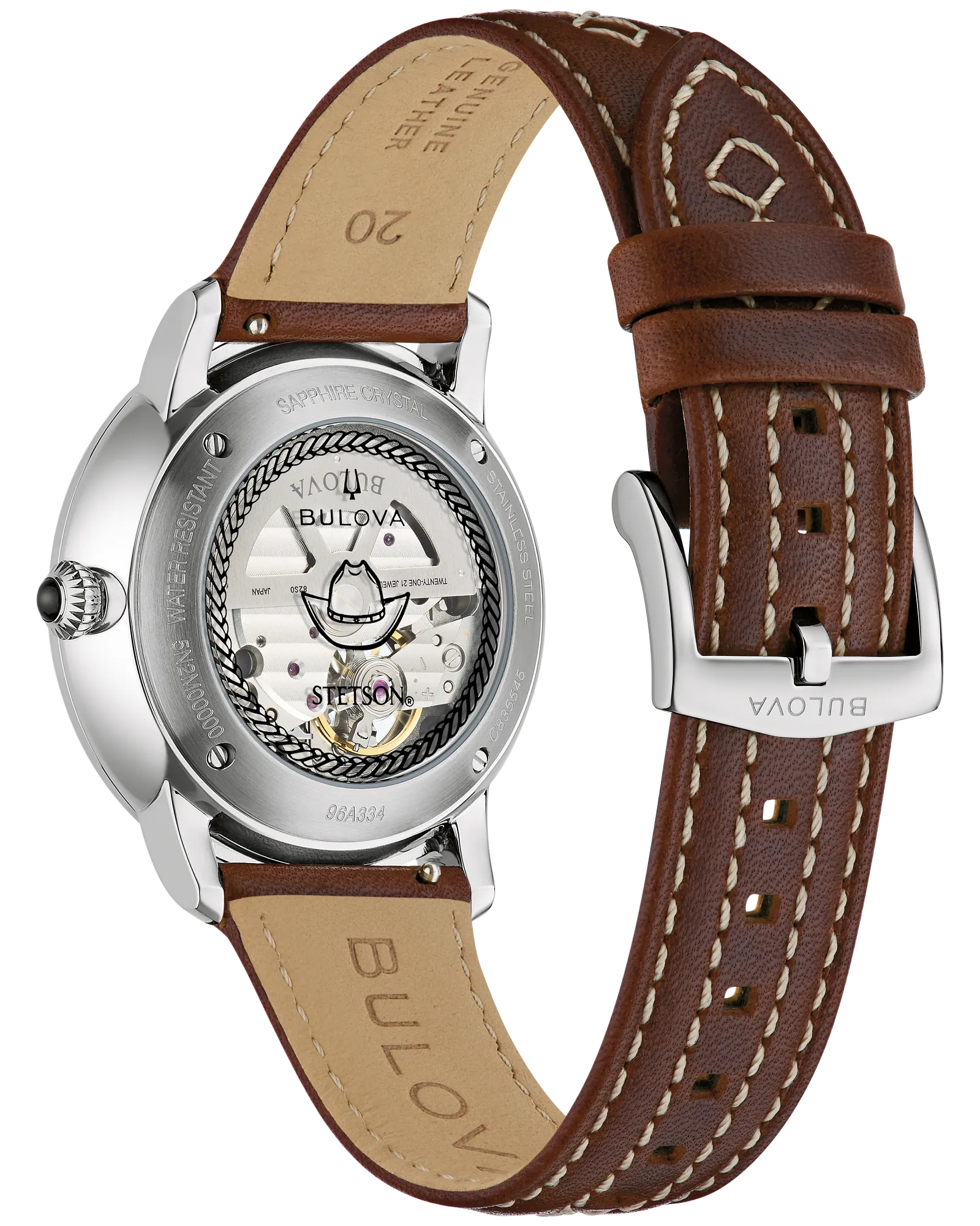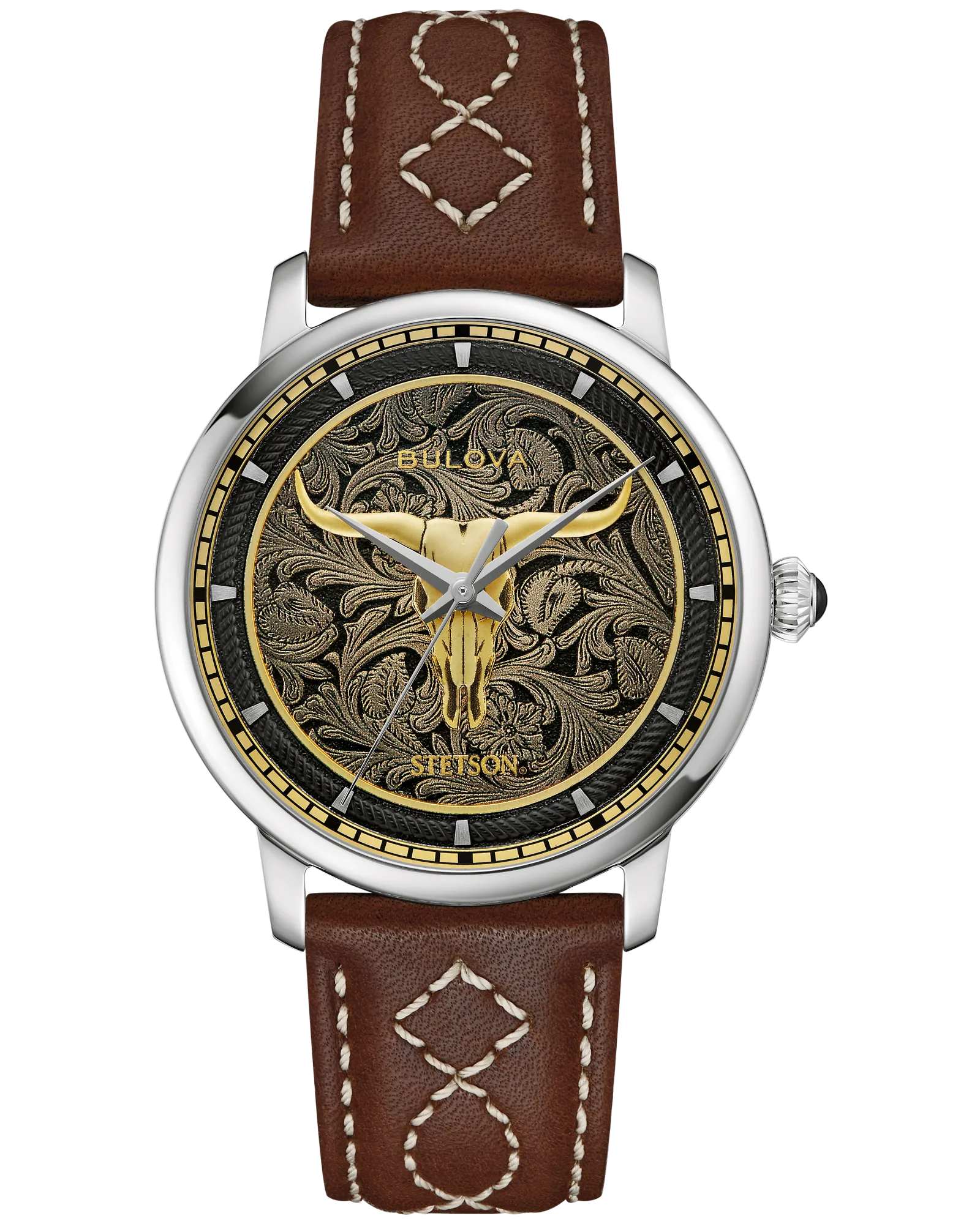Celebrating the 160th anniversary of the John B. Stetson Company, this Bulova collaboration merges two American icons into a singular statement piece. The black dial showcases a striking gold-tone Texas Longhorn skull in relief, layered beneath ornamental floral detailing drawn from classic western craftsmanship. A 39mm silver-tone stainless steel case houses the timepiece, refined with a sapphire crystal and an onion crown accented by black onyx. The transparent case back reveals the automatic 21-jewel movement—a self-winding mechanism powered by natural wrist motion—alongside a printed Stetson hat motif framed by a laurel wreath. Splash-resistant construction and a 42-hour power reserve ensure reliable daily wear, while the brown leather strap completes the western aesthetic. A watch that honors dual legacies of precision engineering and heritage design.