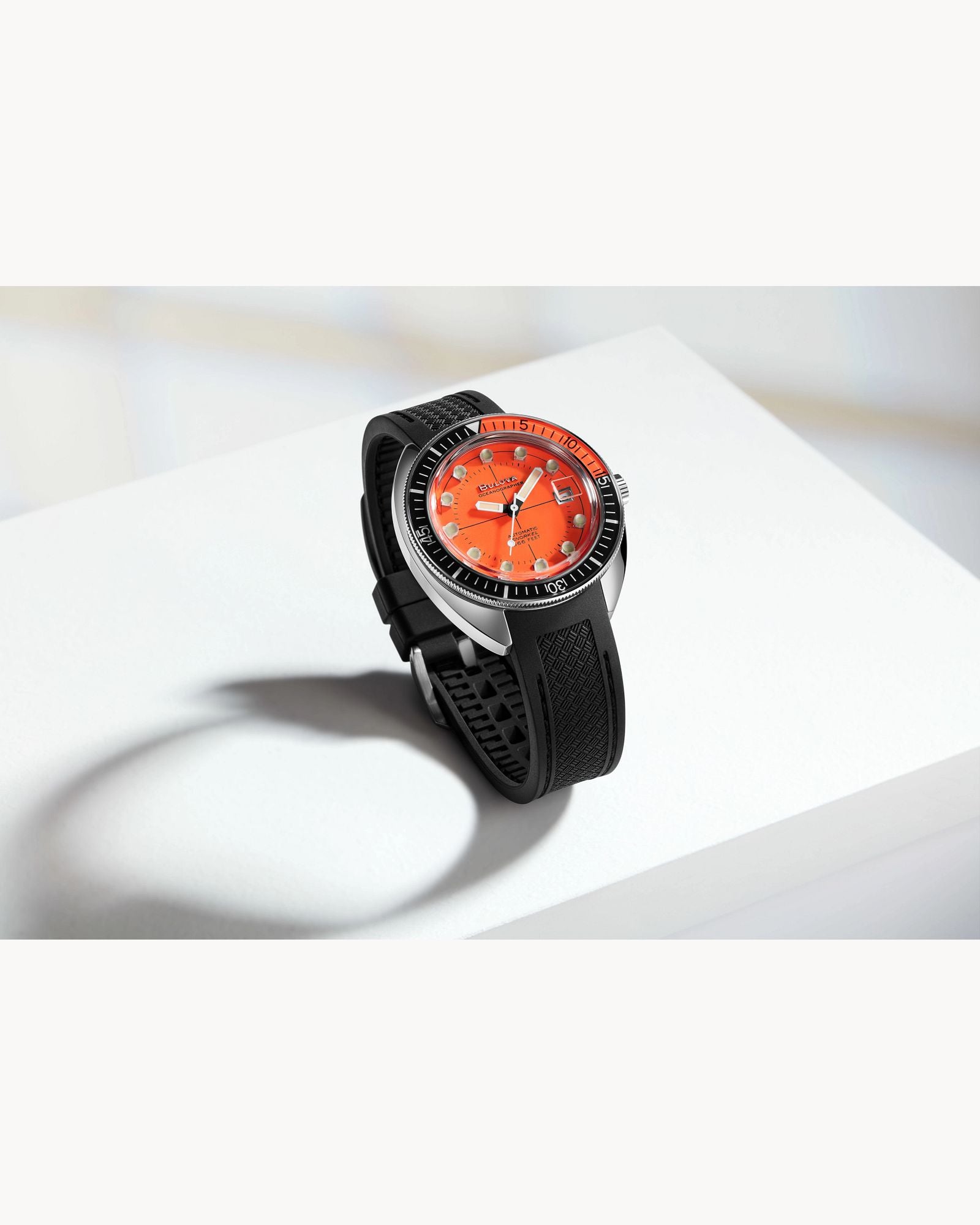 The Bulova 96B350 Oceanographer merges technical dive-watch credentials with modern styling. Its 41mm stainless steel case frames a vibrant orange dial beneath a domed sapphire crystal, complemented by a dual-tone rotating bezel and resilient rubber strap. The automatic Miyota caliber drives essential functions including date display, while ISO certification and screw-down crown validate 200-meter water resistance. Built for those who demand both precision and presence—a contemporary take on dive-watch heritage for the serious enthusiast.