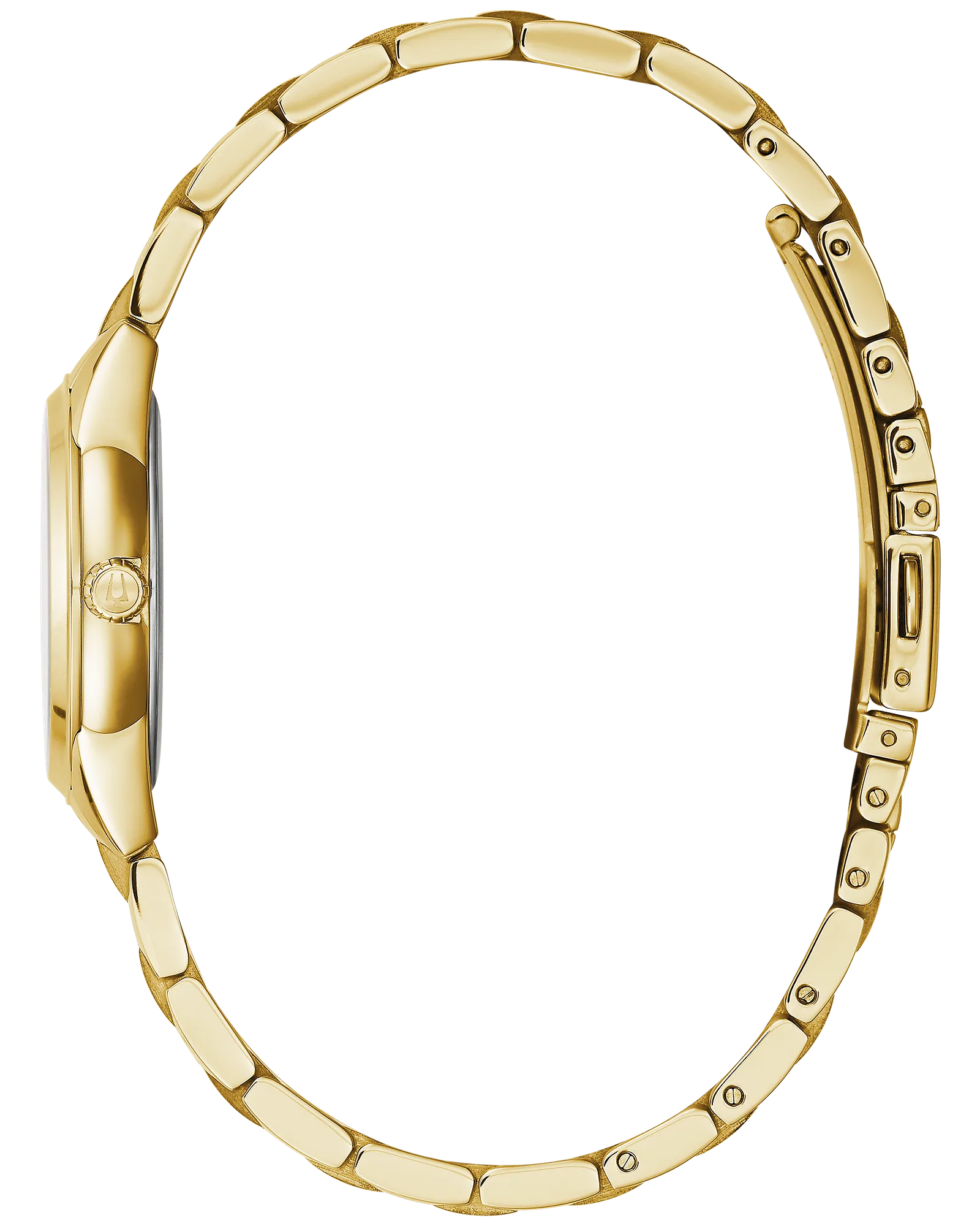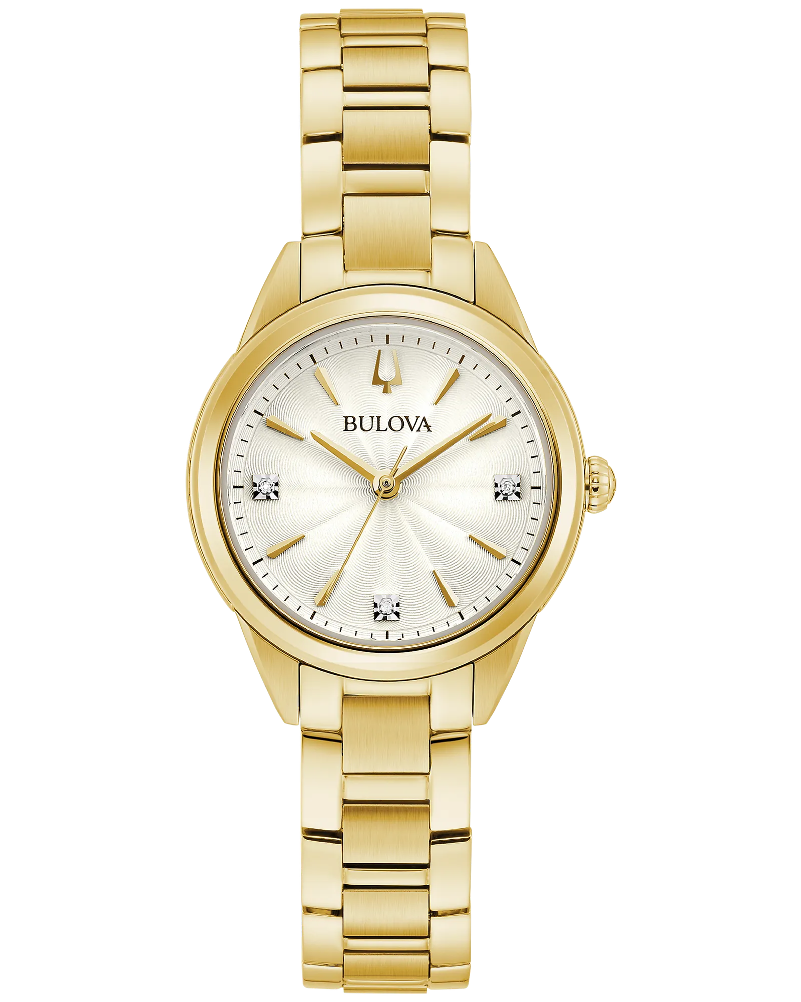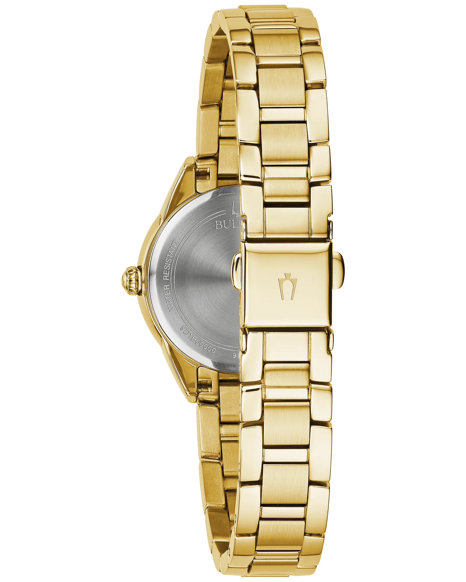 Crafted from gold-tone stainless steel, this timepiece combines a polished case with a matching bracelet for refined elegance. The silver white dial showcases three strategically positioned diamonds alongside gold-tone hands and hour markers, creating a sophisticated aesthetic. Protected by a domed mineral crystal, the watch offers both clarity and durability. A secure fold-over buckle closure ensures reliable fastening and everyday wearability.