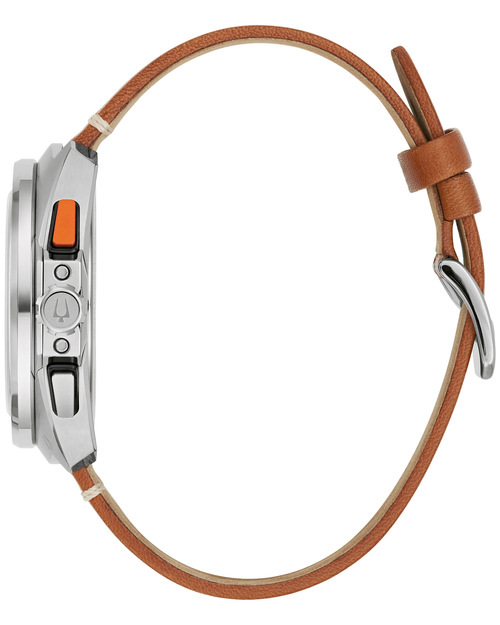 Rooted in Bulova's storied motorsport heritage, the men's Racer chronograph delivers precision engineering wrapped in automotive-inspired design. The 42mm silver-tone stainless steel case showcases aerodynamic contours reminiscent of high-performance vehicles, while an orange and black tachymeter bezel adds functional sophistication. The black dial features a striking racing-pattern chapter ring with orange accents, complemented by a bold orange chronograph seconds hand for superior visibility. A comprehensive 5-hand chronograph mechanism tracks minutes and 24-hour time via subdials, with date display at 6 o'clock. Luminous applied markers and beveled hands ensure readability in any condition. The perforated brown leather racing strap with pin buckle reinforces the performance aesthetic. Powered by precise quartz movement, this timepiece seamlessly transitions from track to street, embodying both technical excellence and racing passion.