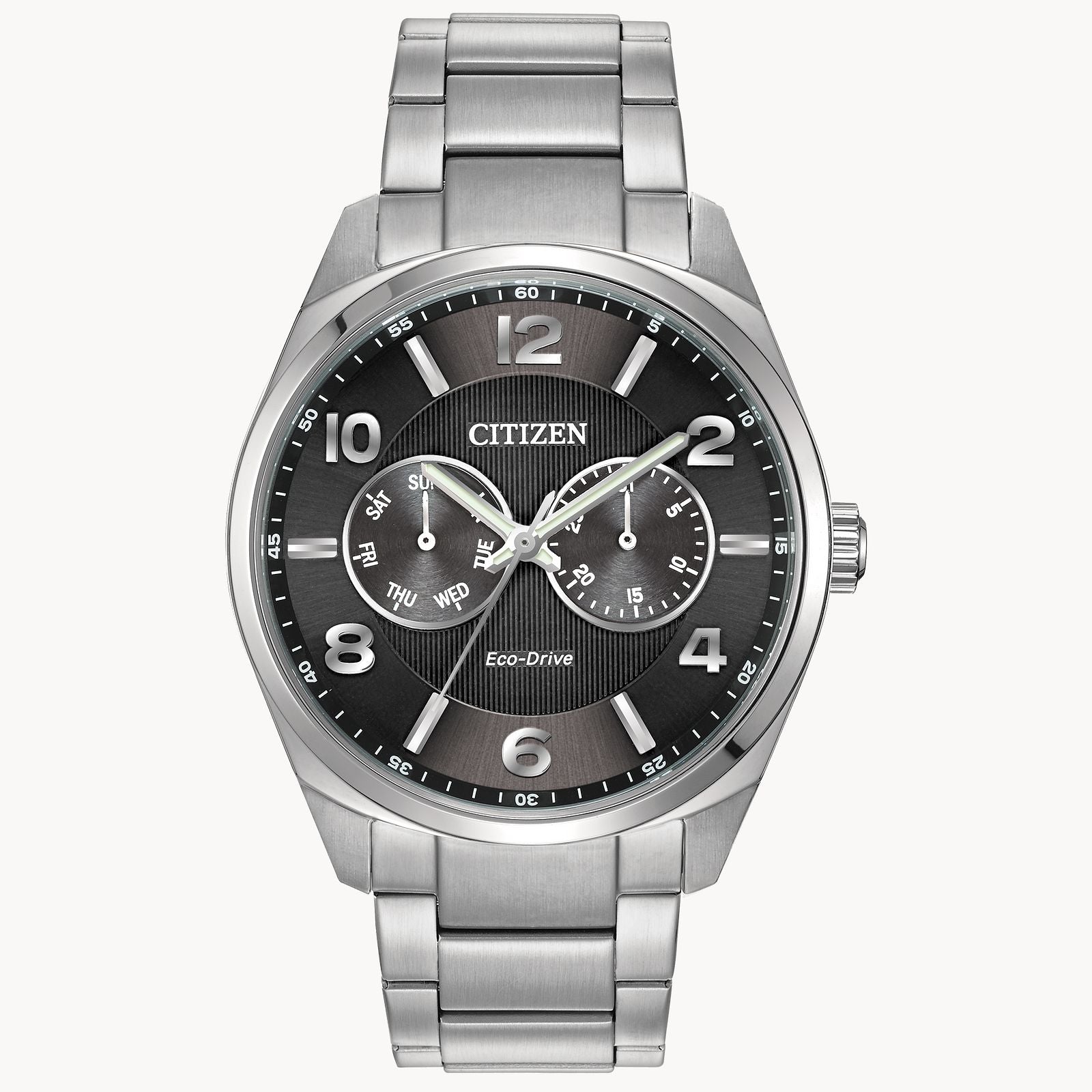 A modern classic rediscovered with this analog day/date dress timepiece. In stainless steel with a black dial and day-date feature. Featuring our Eco-Drive technology – powered by light, any light. Never needs a battery. Caliber number 8635.