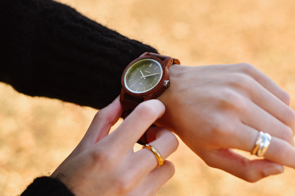 This unisex watch shows hour, minute, and second markers on a round dial. The Hampton II is made from 100% recycled or reclaimed wood, with Miyota watch movement from Japan and is adjustable in size.