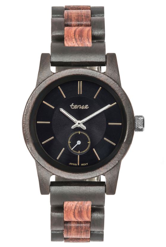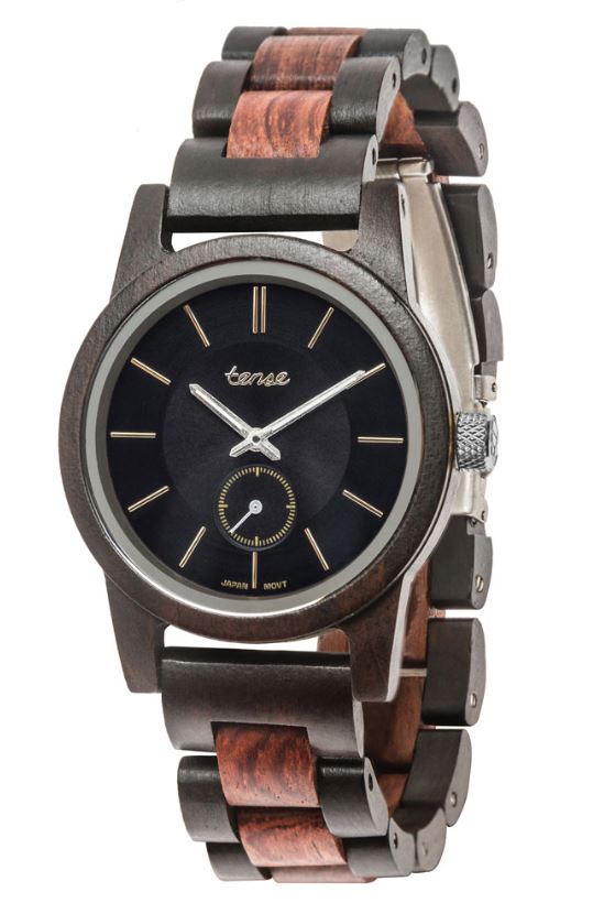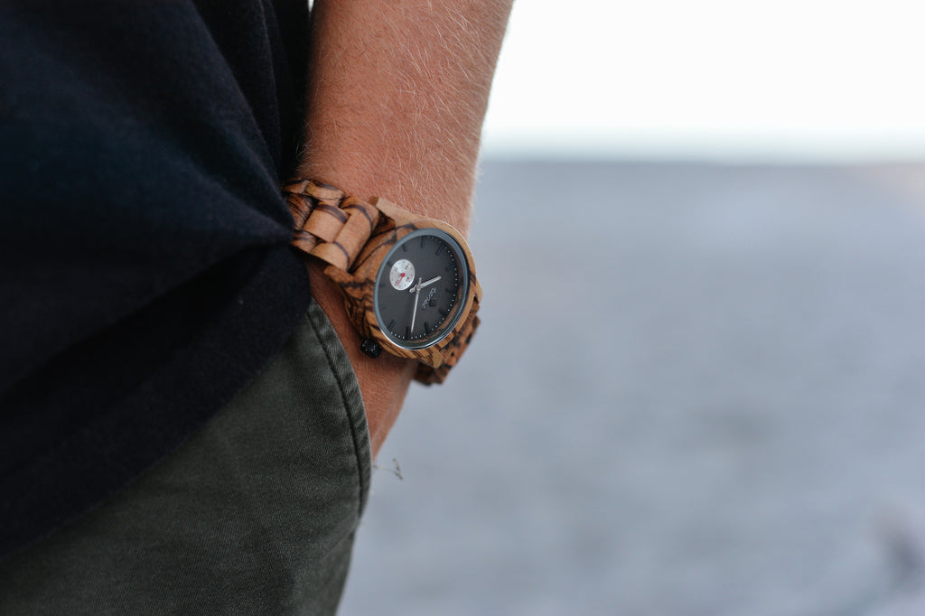This unisex watch shows hour, minute, and second markers on a round dial. The Hampton is made from 100% recycled or reclaimed wood, with Miyota watch movement from Japan and is adjustable in size.