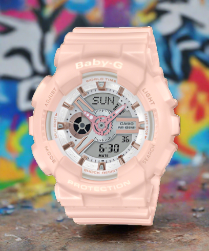 This model is accented with a rose gold metallic design, making this pink digital watch a beautiful combination of heavy-duty and femininity. The base model is the BA110, which is popular for its masculine design. The case and band are standard black. A daring application of a soft rose gold color to metallic parts that serve as cool accents creates a model with nuances that combine a masculine design with feminine coloring.