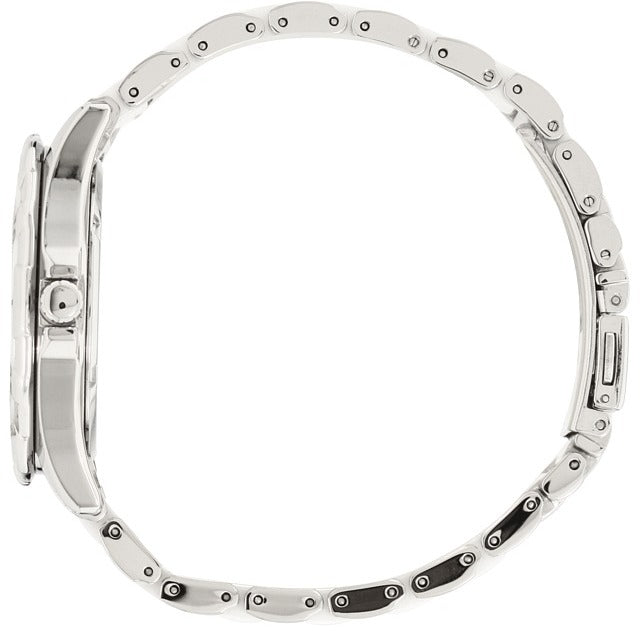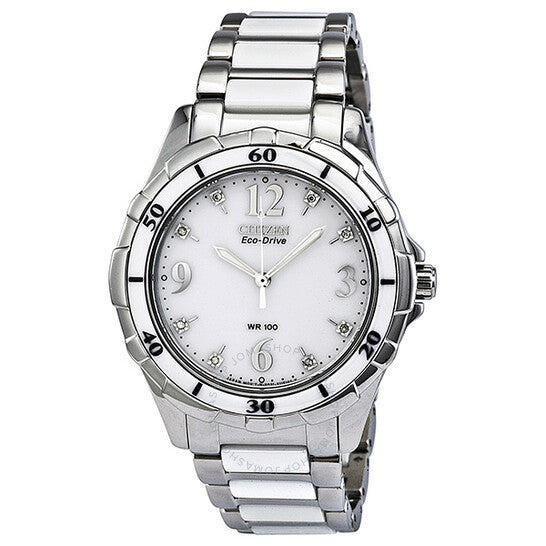 Stainless steel case with a stainless steel and ceramic bracelet. Fixed bezel. White dial with silver-tone hands and diamond hour markers. Arabic numerals mark the 3, 6, 9 and 12 o'clock positions. Minute markers around the outer rim. Dial Type: Analog. Luminescent hands and markers. Eco-drive movement. Scratch resistant mineral crystal. Pull / push crown. Solid case back. Case diameter: 38 mm. Case thickness: 10 mm. Round case shape. Band width: 19 mm. Deployment clasp with push button. Water resistant at 100 meters / 330 feet. Functions: hour, minute, second. Casual watch style. Citizen Ceramic Eco-Drive Diamond White Dial Ladies Watch EM0030-59A.