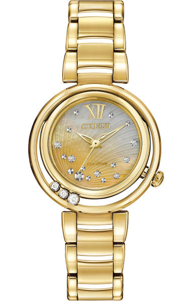 This Citizen Sunrise model is a sophisticated ladies' timepiece featuring Eco-Drive technology and a distinctive floating diamond design.
