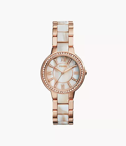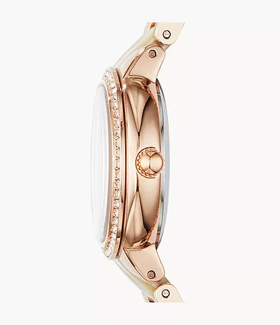 We're revamping the season's classics with clean silhouettes and time-honored materials. Exquisitely crafted in shimmer horn acetate and shiny rose steel, Virginia makes a statement with 86 sparkling multi-color stones.