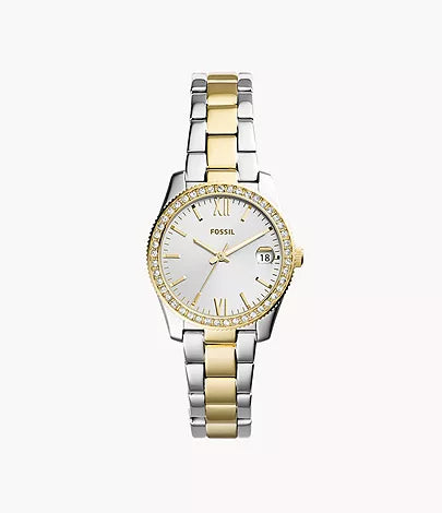 This 32mm Scarlette Mini features a sunray dial with Roman numerals at the 12 and six-hour marker, three-hand date movement and a two-tone steel bracelet.