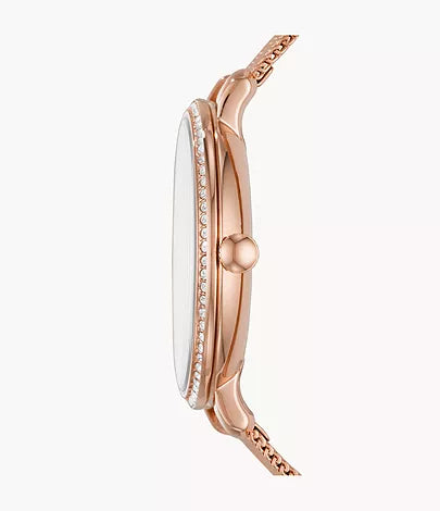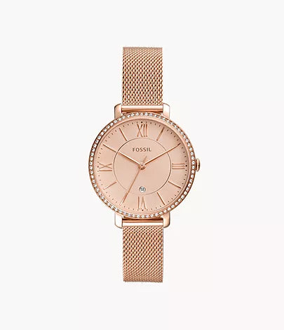 This 36mm Jacqueline features a rose gold-tone sunray dial with a glitz bezel, three-hand date movement and a rose gold-tone stainless steel mesh bracelet.