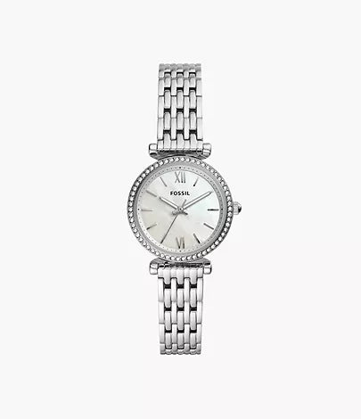 This 28mm Carlie Mini features a mother of pearl dial with a glitz bezel, three-hand movement and a stainless steel bracelet.