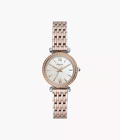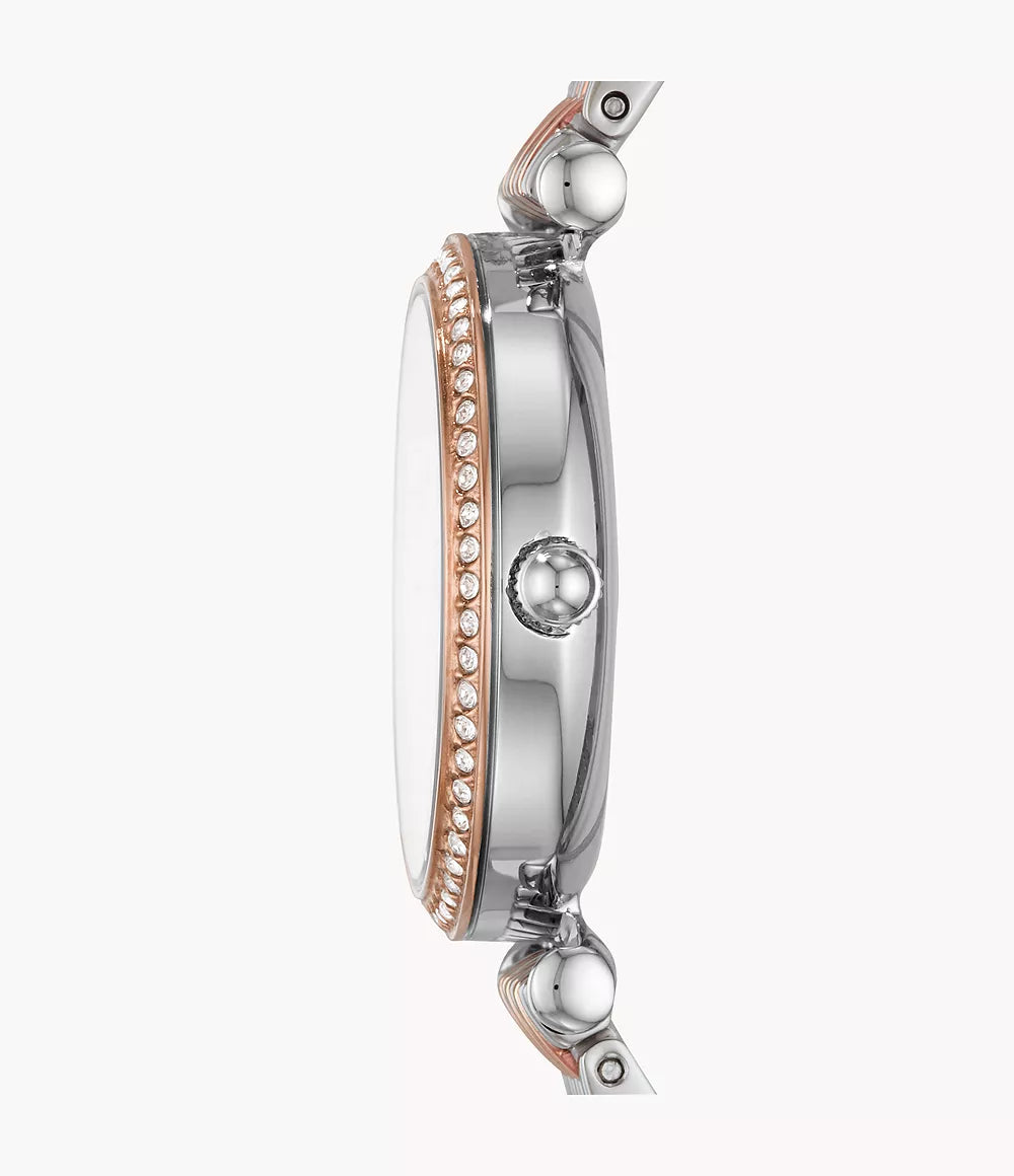 This 28mm Carlie Mini features a mother of pearl dial with a glitz bezel, three-hand movement and a two-tone stainless steel bracelet.