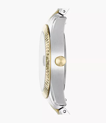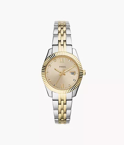 This 32mm Scarlette Mini features a gold sunray dial, three-hand date movement and a two-tone silver and gold stainless steel bracelet.