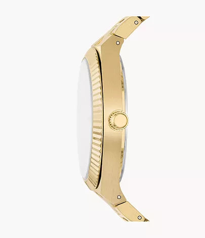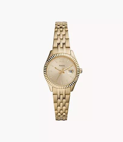 This 28 mm Scarlette Micro features a gold dial with a sunray finish, three-hand date movement and a gold-tone stainless steel bracelet.