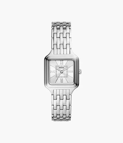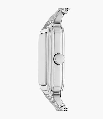 This 27mm Raquel features a silver satin dial, three-hand movement and silver-tone stainless steel bracelet.
