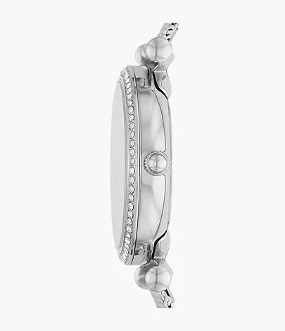 This 28mm Carlie Mini features a pink sunray dial, three-hand movement and silver-tone stainless steel mesh bracelet.