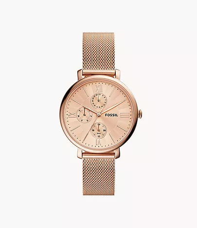 This 38mm Jacqueline features a rose gold cd finish dial, multifunction movement and rose gold-tone stainless steel mesh bracelet.