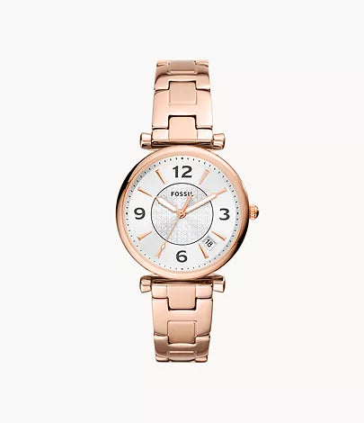This 35mm Carlie features a white sunray dial, three-hand date movement and rose gold-tone stainless steel bracelet.