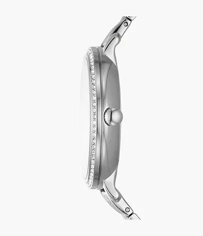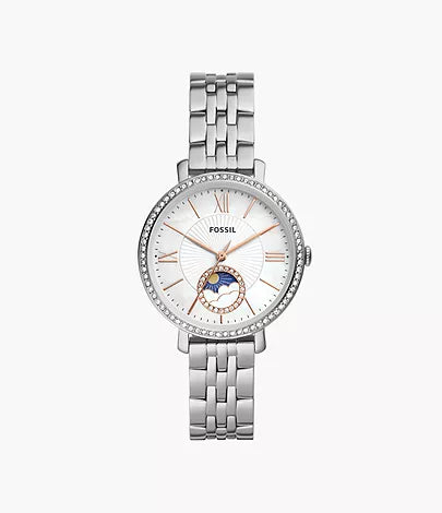 This 36mm Jacqueline features a white mother of pearl glossy and textured dial, sun moon multifunction movement and stainless steel bracelet.