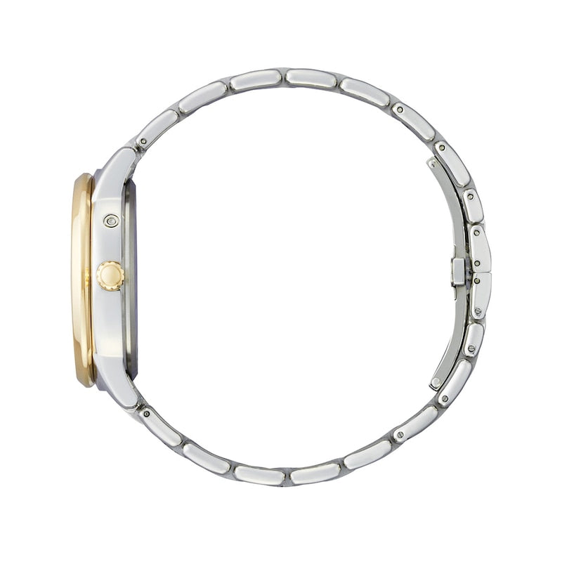 The Calendrier women’s watch from Citizen features a two-tone stainless steel bracelet and 37mm two-tone stainless steel case. It has a white mother of pearl three-hand dial, inset with diamonds for an elegant touch. In addition to Eco-Drive technology, the watch also tracks moon phase movement, along with providing the month, day and date. It is a perfect blend of style and technology for the modern woman.