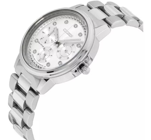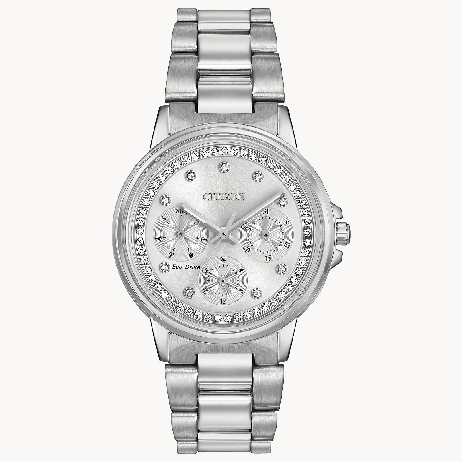 Show off your fashionable side wearing a statement timepiece adorned with bright crystals. Bracelet style timepieces with lots of sparkle are hallmarks of the Citizen Silhouette Crystal collection. Featured here in stainless steel with silver dial, day, date and 12/24-hour time. Featuring our Eco-Drive technology – powered by light, any light. Never needs a battery. Caliber number 8729.