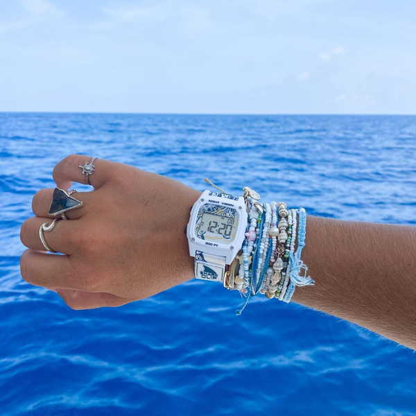 The Octopus model, measuring 38mm, embodies smart design with a retro-futuristic appeal. It includes the Shark Clip, the signature clip band system that launched the Freestyle brand. Functioning like a seatbelt, this clip securely fastens your watch for a comfortable, snug fit. As with all Shark Watches, the Shark Clip comes with a limited lifetime warranty for enduring quality and reliability.