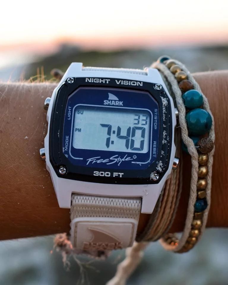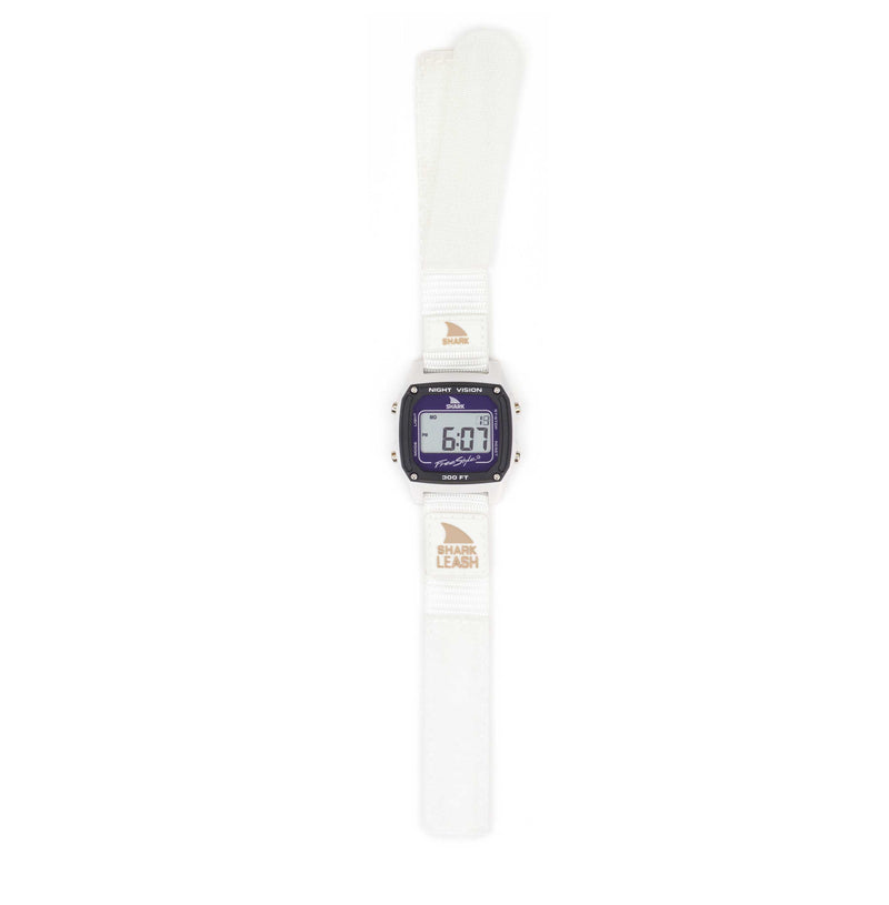 The 38mm White Dolphin returns featuring the original Leash band that defined Freestyle Watches in the late 1980s. Its hook and loop closure system, inspired by vintage ’80s surfboard leashes, ensures a secure, dynamic fit. Packed with essential digital functions such as time, date, stopwatch, countdown timer, alarm, and night vision backlight, the Shark Leash is ready for any adventure. Water resistant up to 100 meters and protected by our limited lifetime warranty, this watch embodies the spirit of Shark to the Future.