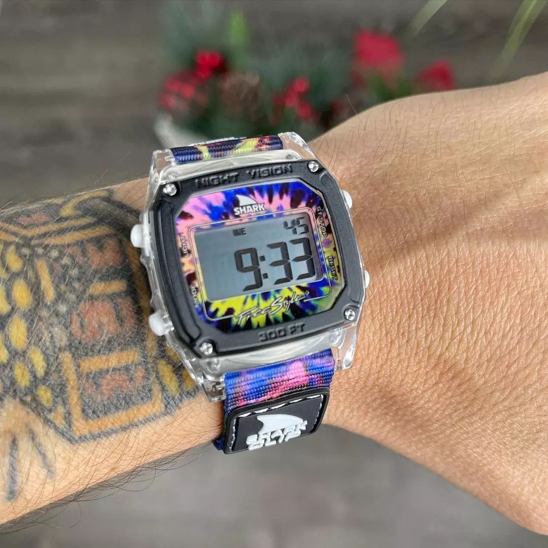 Style: FS101172 Full disclosure, we love SHARKS! So, it was only natural that we team with the Discovery Channel on another SHARK WEEK Collaboration. This limited edition watch collaboration celebrates 34 years of Shark Week. The Mega Tie Dye Megalodon Shark Classic Clip brings the top of the food chain straight to your wrist with a pop of psychedelic tie-dyed strap and lens with a transparent case body Like all Freestyle SHARK watches it is backed by a Limited Lifetime Warranty.