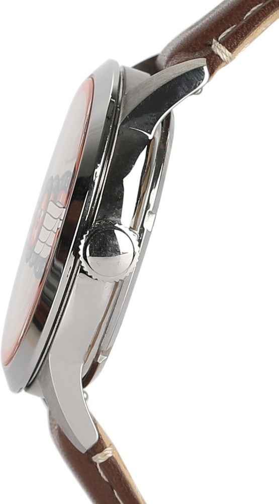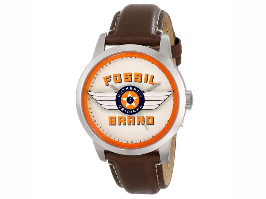 Stainless steel case with a brown leather strap. Fixed stainless steel bezel. White dial with silver-toned hands. Minute markers around the outer rim. Dial Type: Analog. Quartz movement. Scratch resistant mineral crystal. Pull / push crown. Solid case back. Case diameter: 40 mm.
