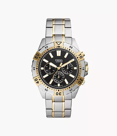 This 44mm Garrett features a black sunray dial, chronograph movement and a two-tone silver and gold stainless steel bracelet.