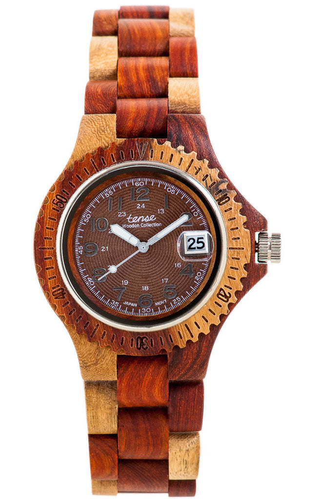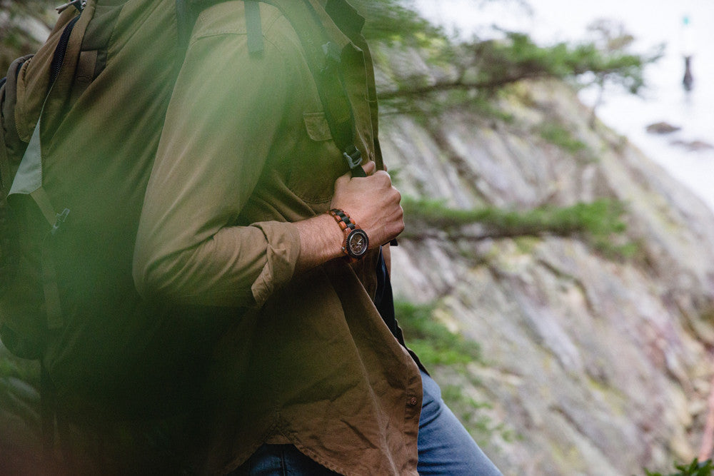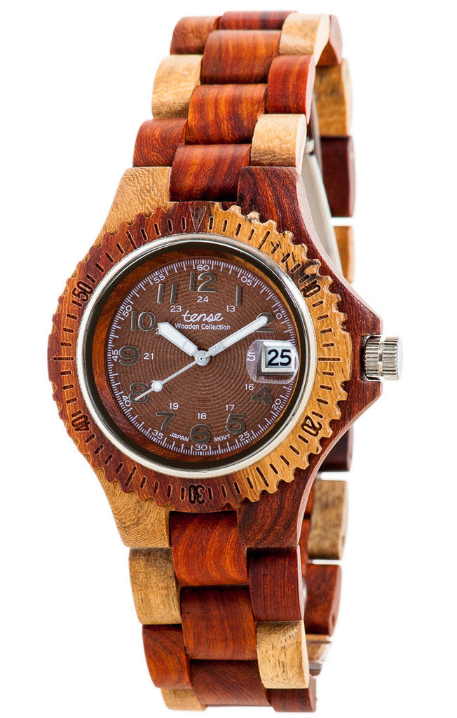 This men's watch shows hour, minute, second markers and the calendar date on a round face. The Compass is made from 100% recycled and reclaimed wood, with Miyota watch movement from Japan and is adjustable in size with stainless steel crown and clasp.