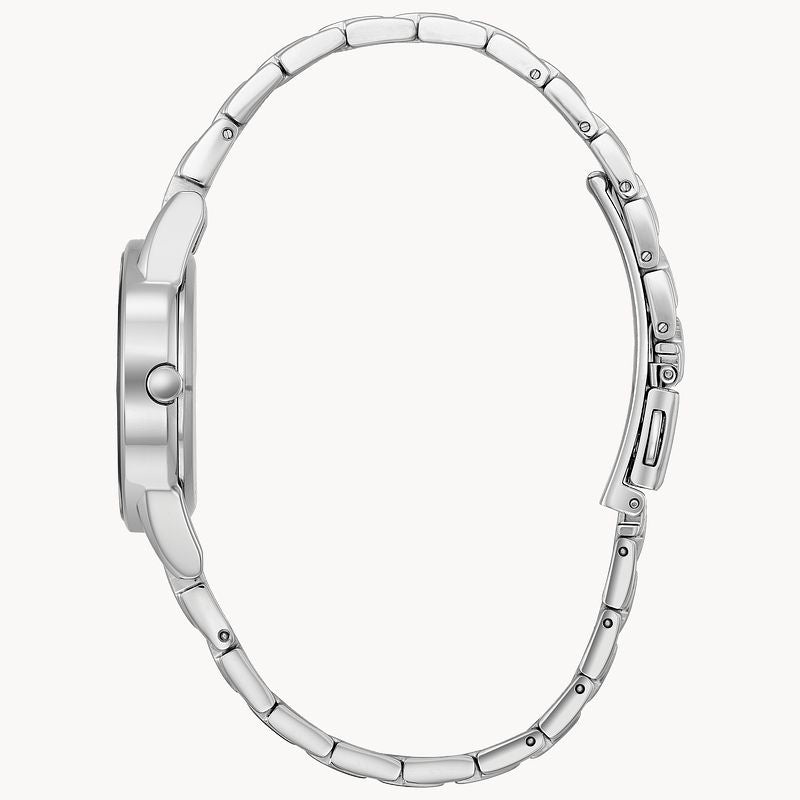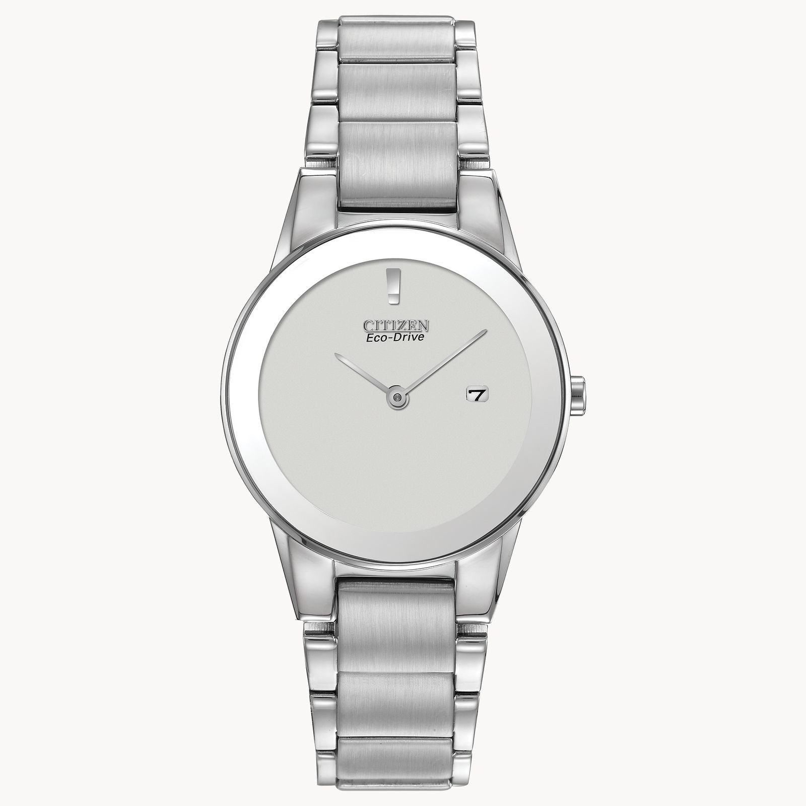 Axiom's refined yet sleek design offers a day-to-night fashion options for the avid trendsetter. In stainless steel bracelet with a white dial and stainless steel accents and the intriguing feature of edge-to-edge glass. Featuring our Eco-Drive technology – powered by light, any light. Never needs a battery. Caliber number J015.