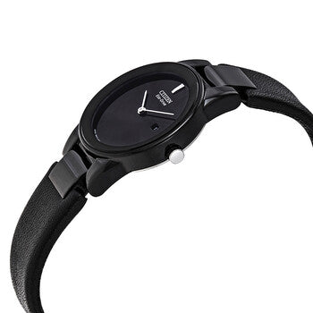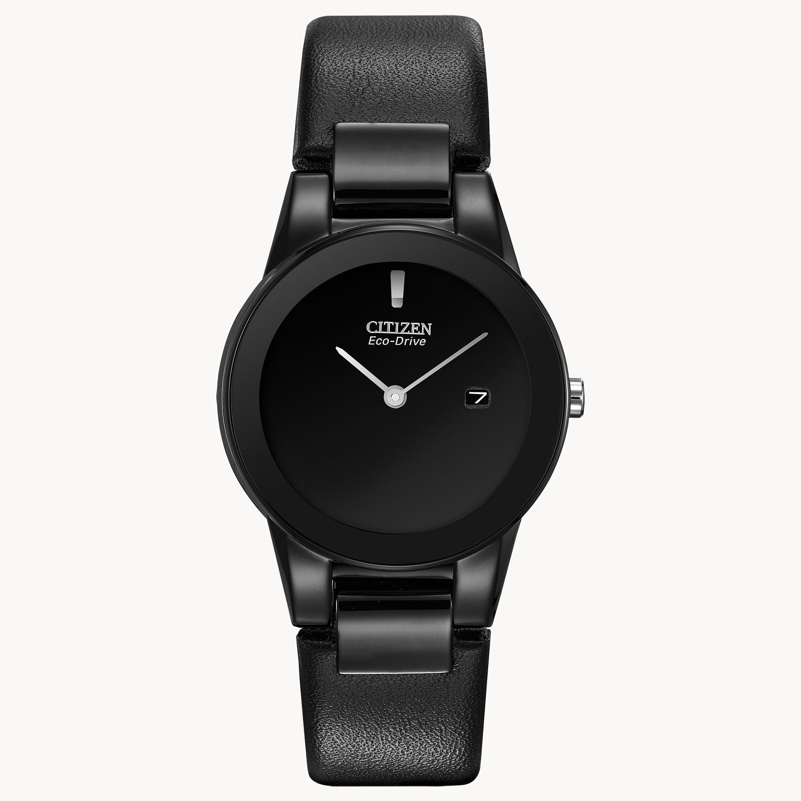 Axiom's refined yet sleek design offers a day-to-night fashion option for the avid trendsetter. In stainless steel with black ion plating, black leather band, black dial and stainless steel accents and the intriguing feature of edge-to-edge glass. Featuring our Eco-Drive technology – powered by light, any light. Never needs a battery. Caliber number J015.