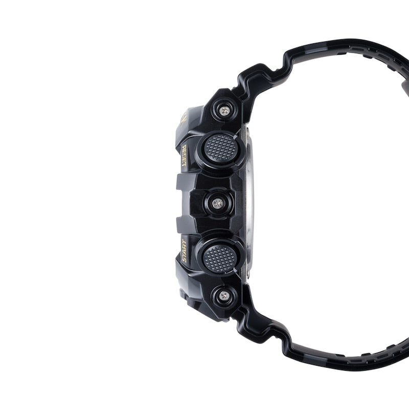 A model with garish colors from G-SHOCK, which continues to evolve in the pursuit of toughness. Uses as the base model the GA-700, with three-dimensional hour and minute hands and powerful indices created using a unique resin-molding technology. A lineup of black and gold models reminiscent of accessories and fashion items that b-boys might wear. The whole body has a glossy finish, giving it a tough, energetic style. A model with colors the look great with street fashion based on a standard GA-700 G-SHOCK model.