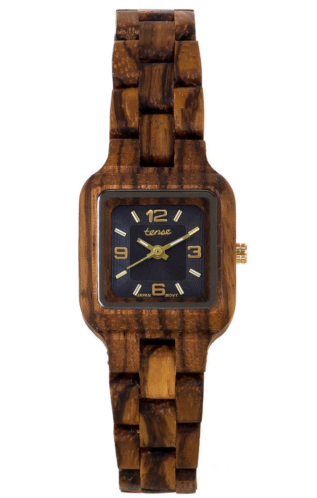 This women's watch shows hour, minute, second markers on a rectangular face. The Small Summit is made from 100% recycled and reclaimed wood, with Miyota watch movement from Japan and is adjustable in size with stainless steel crown and clasp.