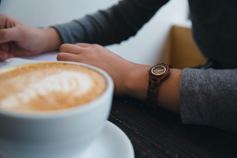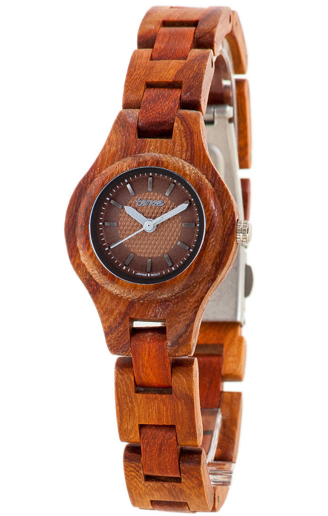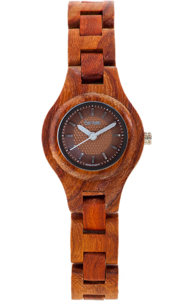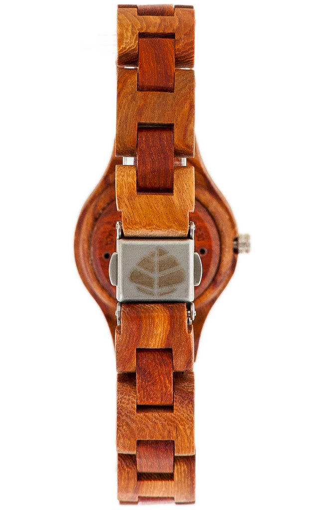 This women's watch shows hour, minute, second markers on a round face. The Small Pacific is made from 100% recycled or reclaimed wood, with Miyota watch movement from Japan. It is adjustable in size with stainless steel crown and clasp. All Tense Watches are Proudly Made In Canada.