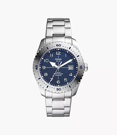 This 42mm limited edition DF-01 features a blue satin, textured dial, solar movement and silver-tone stainless steel bracelet.