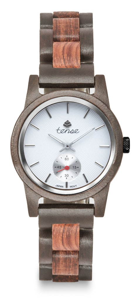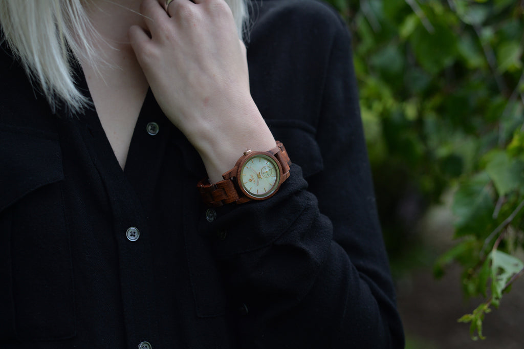 This women's watch shows hourly markers on a round dial. The Small Hampton is made from 100% recycled or reclaimed wood with Miyota watch movement from Japan and is adjustable in size.