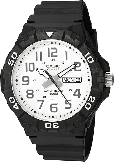 This Casio Men's 'Diver Style' Quartz Resin Watch features a 44.6mm dial with prominent indexes for quick readability. Equipped with a bi-directional rotating bezel and water resistance up to 100 meters, it offers practicality, durability, and user-friendly operation for everyday wear.