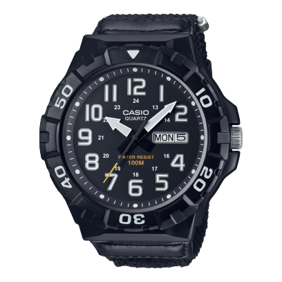 CASIO introduces the MRW210HB series featuring durable outdoor Velcro bands. Designed for practicality, these watches offer 100-meter water resistance and a rotatable bezel for precise timing. Equipped with a separate day-date window and prominent Arabic numerals, they ensure easy readability in various conditions.