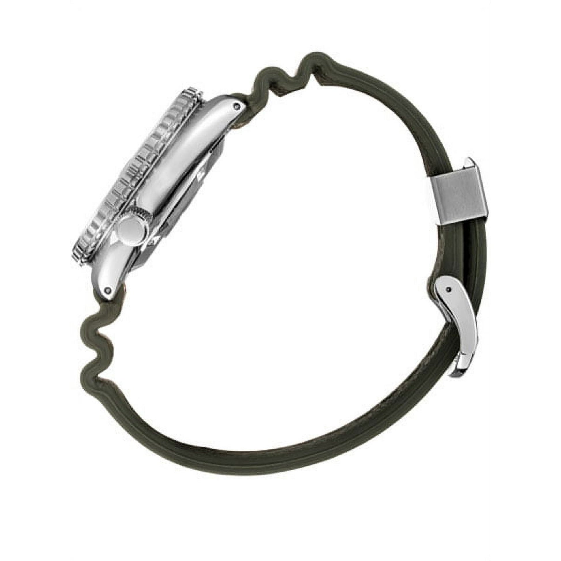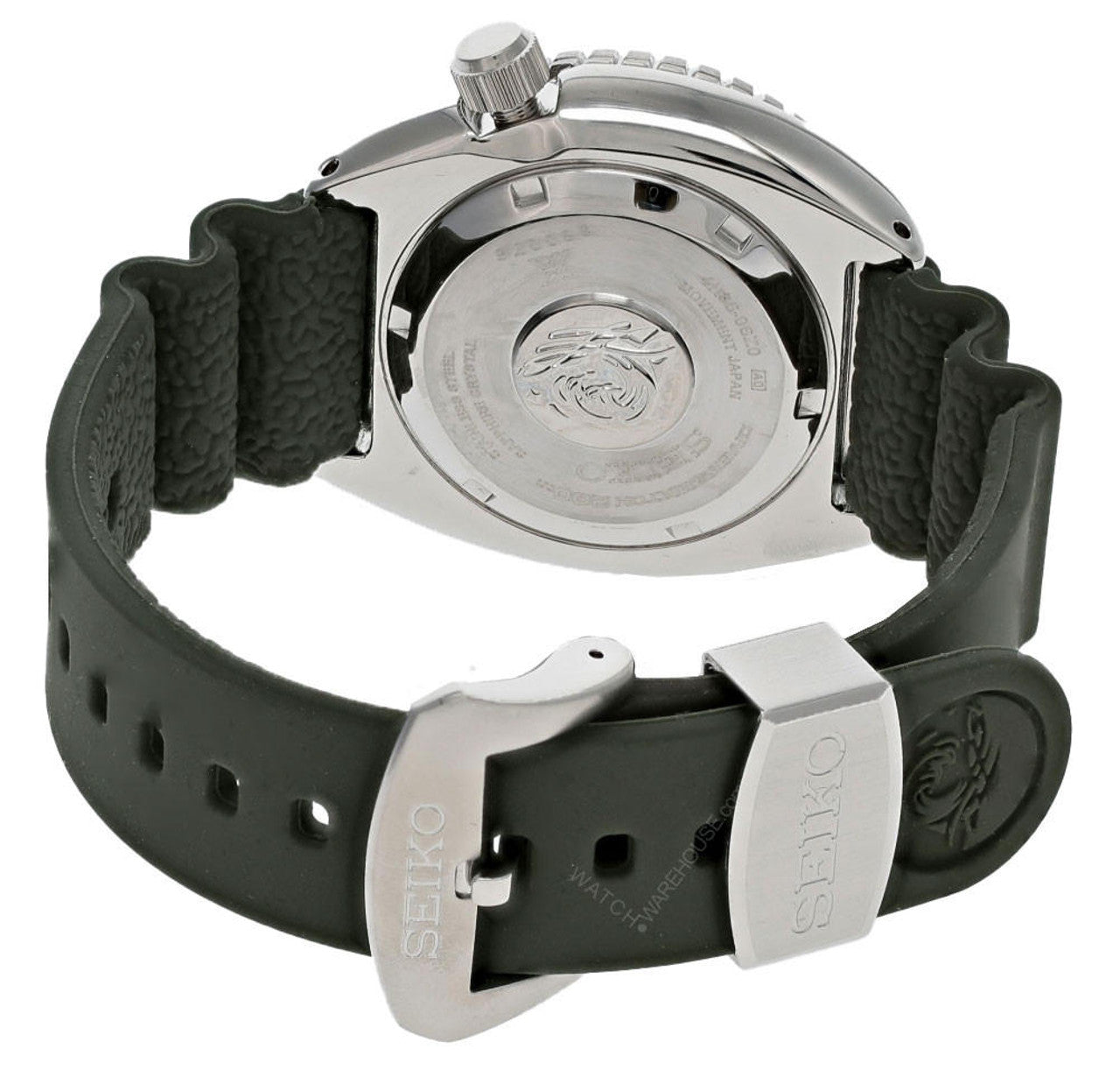 Designed for those who treat life as the ultimate adventure, the Seiko Prospex line meets every challenge with technological excellence and winning design. Upgrading an iconic style with a ceramic bezel and a sapphire crystal with anti-reflective coating on the inner surface, this rugged, yet distinctive, timepiece offers a three-dimensional pressed pattern on the khaki green dial, mirroring the shape of the bezel edge. LumiBrite hands and markers, and a magnified day/date window ensure legibility in rough conditions. The 24-jewel automatic movement beats at a frequency of 21,600 vibrations per hour, with a power reserve of approximately 41 hours, and can be wound manually or automatically. In stainless steel, with black ceramic one-way rotating elapsed timing bezel, secure screwdown crown and caseback, and durable khaki green silicone strap, this high-intensity watch follows ISO standards for scuba diving. 200m Water Resistant