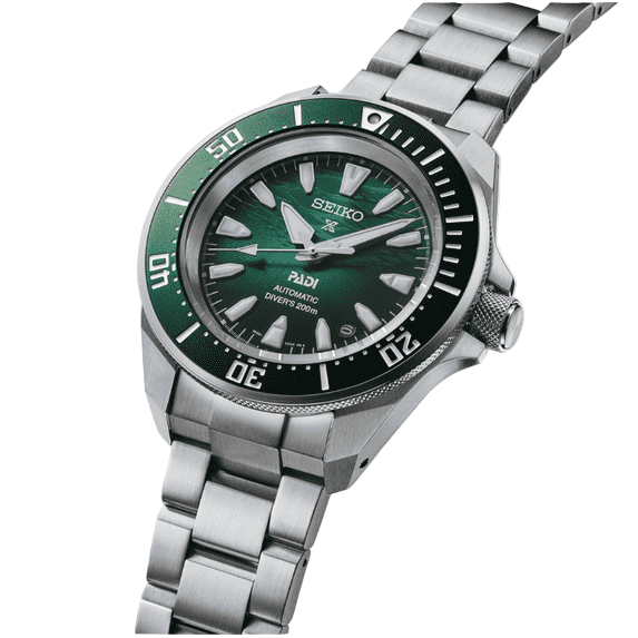 Seiko’s Prospex Automatic Diver PADI Special Edition is crafted for adventurers who push boundaries. Celebrating Seiko’s enduring partnership with PADI, this model draws inspiration from a classic dive watch, featuring an enhanced, streamlined case design. Powered by a 23-jewel automatic movement vibrating at 21,600 beats per hour, it offers about 41 hours of power reserve and supports both manual and automatic winding. The vibrant green dial, inspired by sunlit ocean waves, includes a date display and LumiBrite hands and markers, surrounded by a unidirectional bezel. Constructed from stainless steel, it meets ISO scuba diving standards, with a screw-down crown, caseback, and a secure tri-fold clasp. Water resistant to 200 meters.