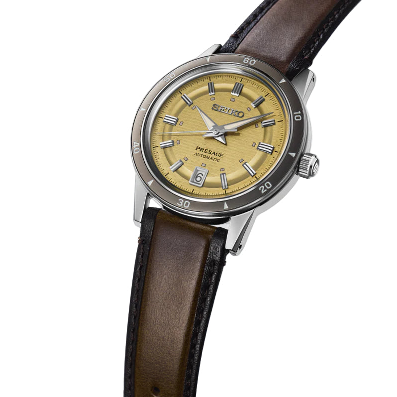 The SRPL75 from the Presage Style60's Collection pays tribute to Seiko’s iconic 1964 “Crown Chronograph,” capturing the vibrant spirit of the 1960s with a blend of robustness and sophistication. Its multi-layer dial, framed by a matching metallic bezel, echoes the original design with a modern twist and is highlighted by a golden yellow hue inspired by mid-century design. Polished faceted indices add elegance, complemented by a stainless steel case and a box-shaped crystal that enhance its depth. Powered by a 23-jewel automatic movement visible through the screw-down transparent caseback, it operates at 21,600 vibrations per hour, offers manual winding, and holds a 41-hour power reserve. The stainless steel case pairs with a brown leather strap, while features like a date calendar and LumiBrite hands and markers ensure functionality. Water resistance is rated at 50 meters (5 bar).