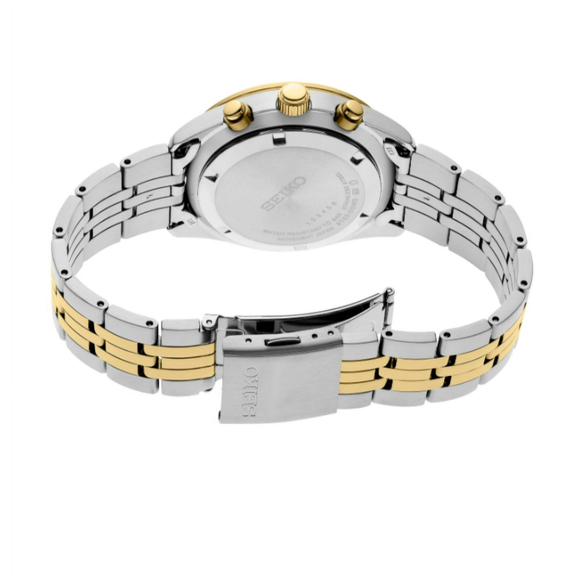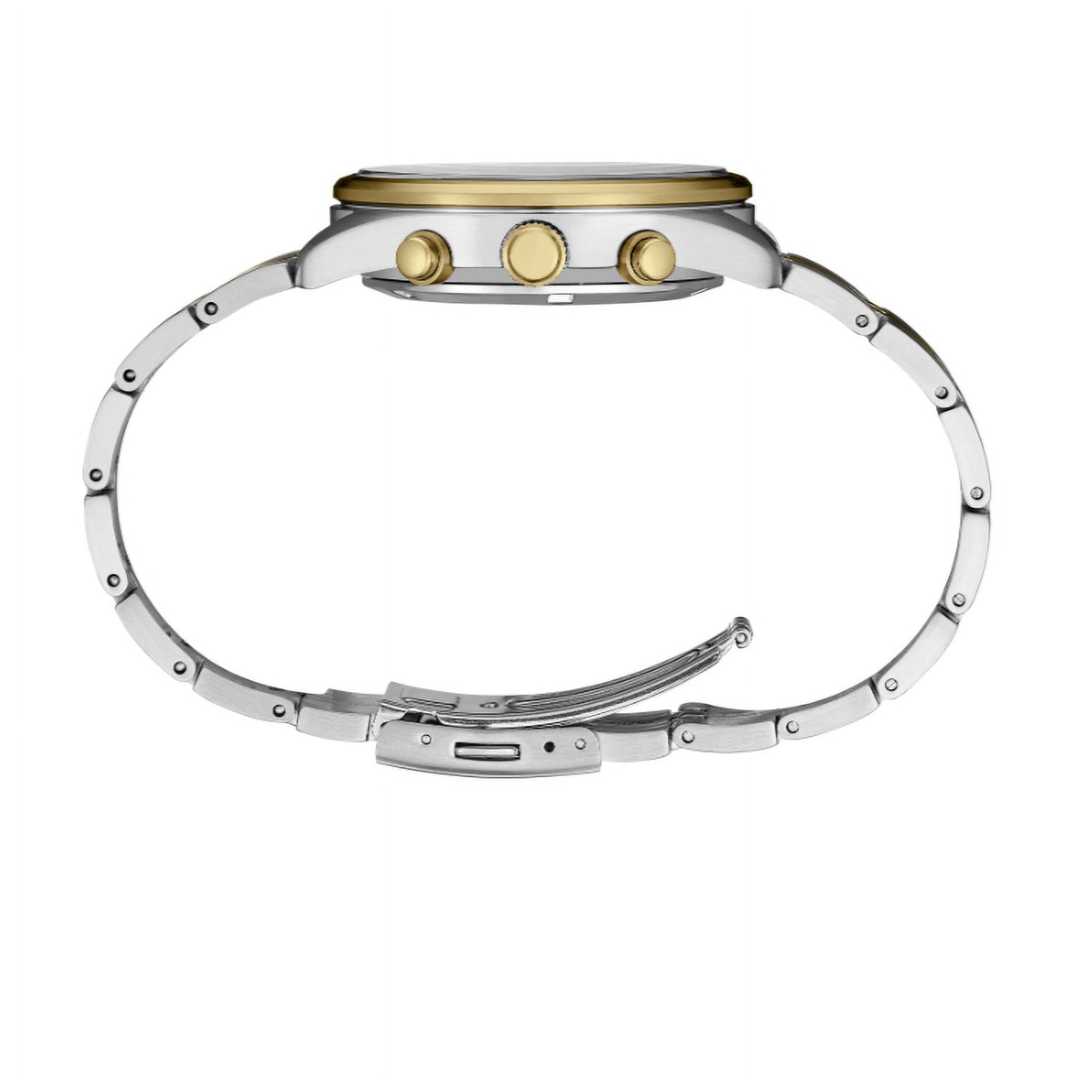 Part of the Essentials Collection, this chronograph draws influence from motorsport design with a black dial featuring bold, gold subdials at 3 and 9 o’clock that evoke a racecar's instrument panel. Encircled by a black tachymeter ring, the dial includes a date display and a 24-hour subdial. The stopwatch function measures elapsed time up to 60 minutes with 1/5-second precision. Constructed from stainless steel with a combination of mirror and brushed finishes, it secures with a tri-fold push-button clasp and offers water resistance up to 100 meters (10 bar).