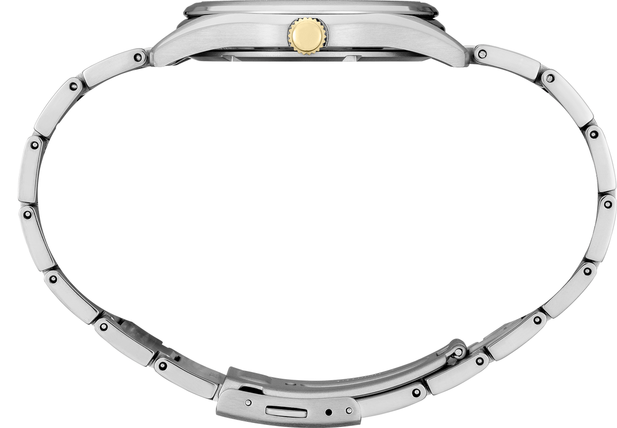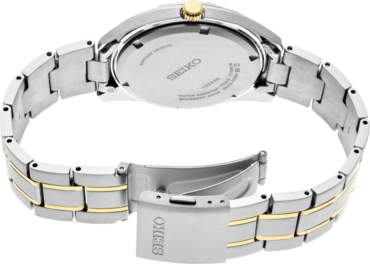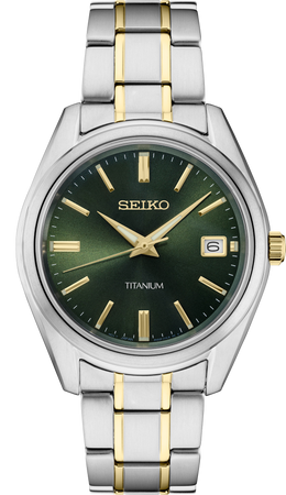 From the Essentials Collection. Offering classic dress/sport designs, the Essentials Collection provides the ideal solution for everyday wear. Crafted of durable and light-weight titanium in two-tone finish, this perfectly tailored watch features a contemporary minimalist green sunray dial with gold accents and date calendar, for a superb blend of clarity and wearability. The sapphire crystal adds superior scratch resistance. 10 bar, 100M Water Resistant
