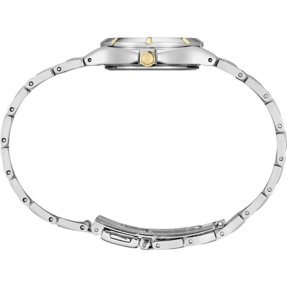 From the Essentials Collection. Offering classic designs, the Essentials Collection provides the ideal solution for all-day wear. With precisely sculpted stainless steel case and bracelet in versatile two-tone finish, this perfectly minimalist watch features a rich charcoal sunray dial with gold hands and stick markers, as well as a date calendar, for a superb blend of clarity and style. 10 bar, 100M Water Resistant