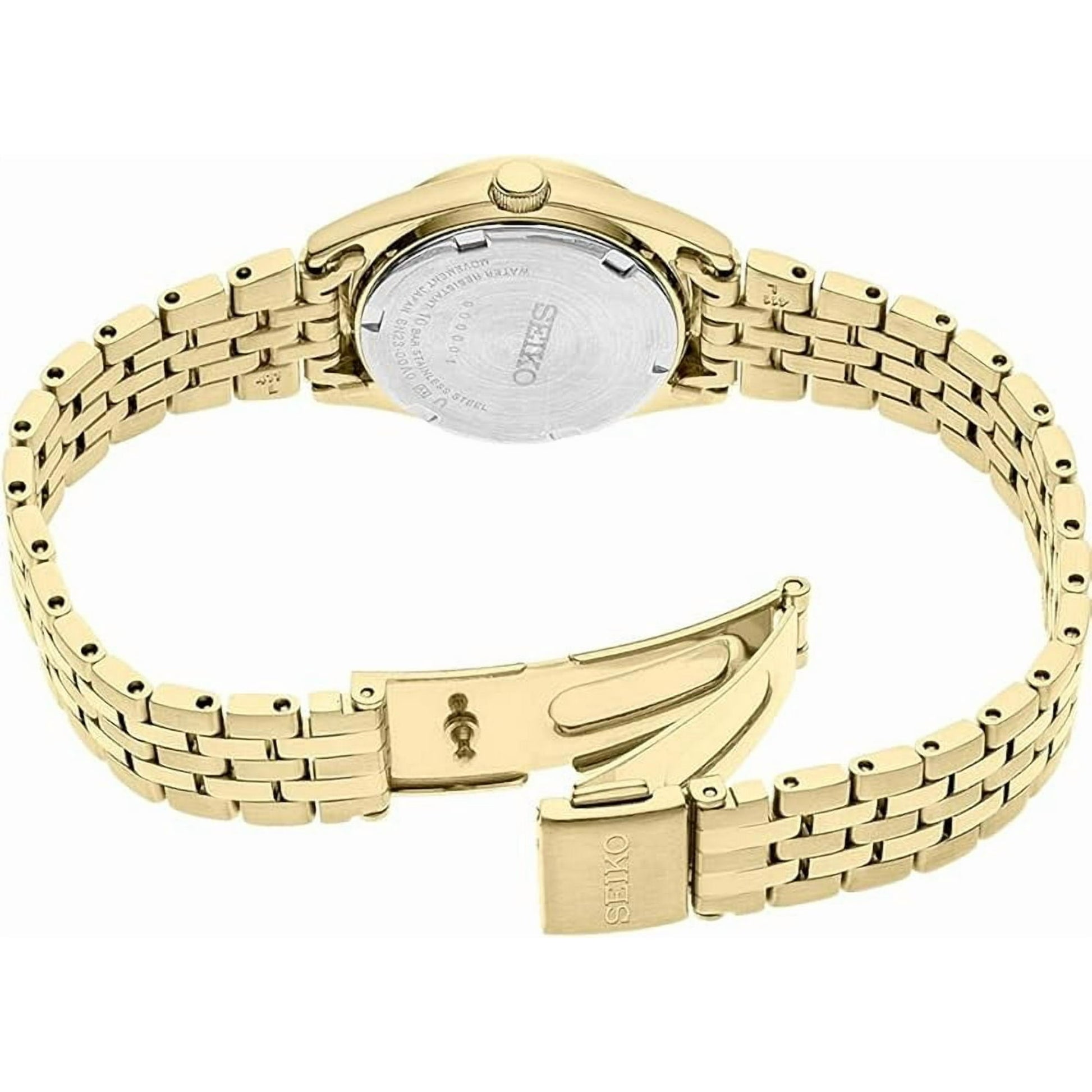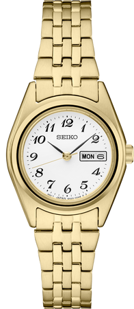 Part of the Essentials Collection, the SUR440 combines timeless dress and sport elements for versatile daily use. Made from stainless steel with a gold-tone finish, this well-proportioned timepiece showcases a white dial accented by Arabic numerals alongside a day and date calendar, delivering both clear readability and refined design. It offers water resistance up to 10 bar (100 meters), making it a reliable choice for everyday wear.