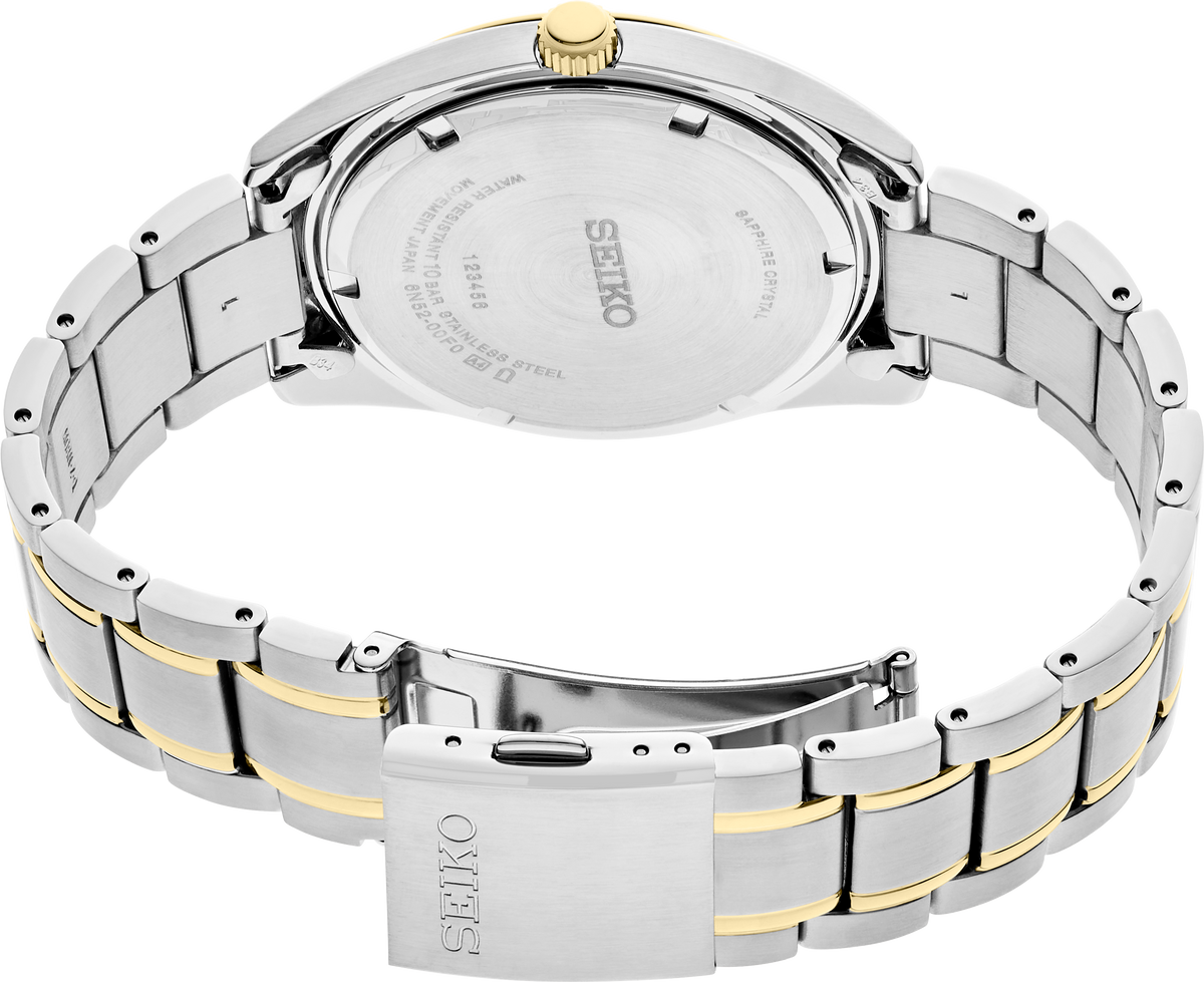 From the Essentials Collection. Offering classic dress/sport design, the Essentials Collection provides the ideal solution for everyday wear. With bold Arabic numerals on a pure white dial with gold accents, this versatile design features a date calendar and LumiBrite hands. Crafted of stainless steel with two-tone finish and scratch-resistant sapphire crystal. 10 bar, 100M Water Resistant