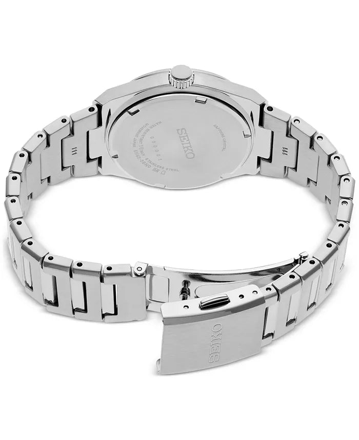 The Essentials Collection offers a fresh interpretation of a timeless look. This sophisticated watch boasts a refined, geometric case and bracelet design that effortlessly transitions from formal events to everyday wear. The deep blue dial features clean, silver hour markers for a modern touch and includes a date window and luminous hands and markers. Made with durable stainless steel and a scratch-resistant sapphire crystal, this adaptable watch also includes a secure screwdown caseback and tri-fold push button release clasp. Water resistant up to 10 bar (100 meters).