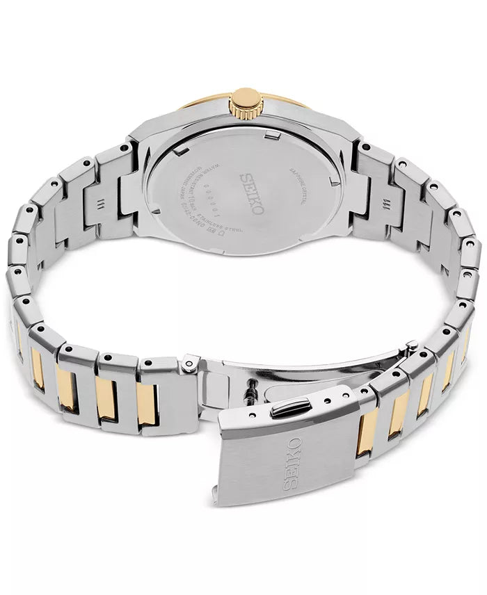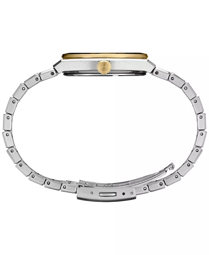 Part of the Essentials Collection, this sophisticated watch offers a refined update on a timeless design. Its sharp, angular case and bracelet suit both formal settings and daily use. The white dial with embossed pattern features straightforward gold-tone stick markers, complemented by LumiBrite hands and a date calendar for enhanced functionality. Constructed from stainless steel with a two-tone finish and protected by a scratch-resistant sapphire crystal, this durable timepiece includes a screwdown caseback and a tri-fold push button clasp for added security. Water resistant up to 100 meters (10 bar).